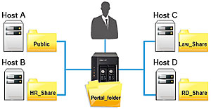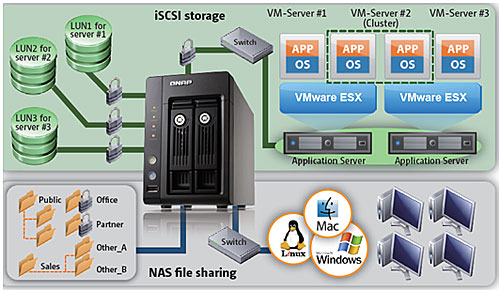 El NAS puede compartir archivos a través de plataformas como Windows, Mac, Linux y UNIX. Cuenta con versátiles aplicaciones para empresas como un servidor de archivos, servidor FTP, servidor de impresora, servidor web y AD (Active Directory) de Windows. Cuenta también con las importantes funciones de WebDAV, agregación de carpetas compartidas (también llamada DFS), pila dual IPv6 e IPv4, Despertar el LAN, encendido y apagado programado, S.M.A.R.T. de la unidad de disco duro, sistema comprensivo de registros y bloqueo de IP no autorizados en base a directivas. Nueva iSCSI para implementaciones de virtualización El Turbo NAS ofrece una implementación flexible y segura de servidores de almacenamiento con las siguientes funciones optimizadas de iSCSI: