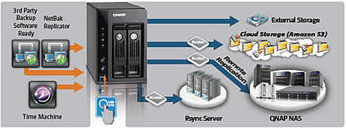 Servidor para copias de seguridad El Turbo NAS le ofrece la solución más completa de creación de copias de seguridad con la aplicación Time Machine de Apple, la replicación remota a un servidor Rsync, el software de Windows NetBak Replicador para crear copias de seguridad, los programas de copias de seguridad de terceros, etc.