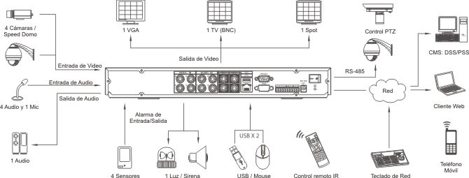 - Servidor web integrado, cliente multi DVR, DMSS y CMS