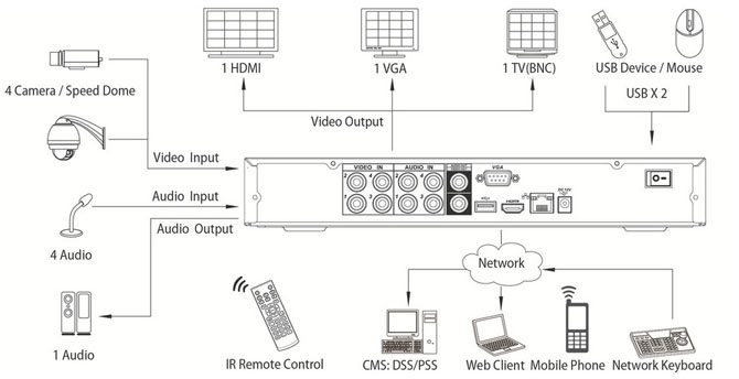 Grabación en tiempo real a D1 en todos los canales, 4 canales de entrada de video y 4 canales de entrada de audio. Puede soportar HDMI, VGA, USB 2.0 y 1 HDD.