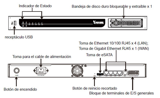 1 x Gigabit, RJ45 (1 puerto WAN) 4 x Ethernet 10/100 BaseT, RJ45 (4 puertos LAN) Puerto USB para copias de seguridad eSATA para DH externo Bloque de terminales 4 x entrada digital 1 x interruptor de salida 1 x salida de energía (12V 1A) |